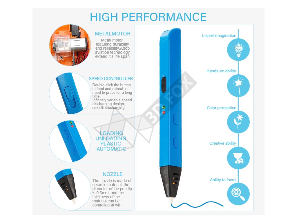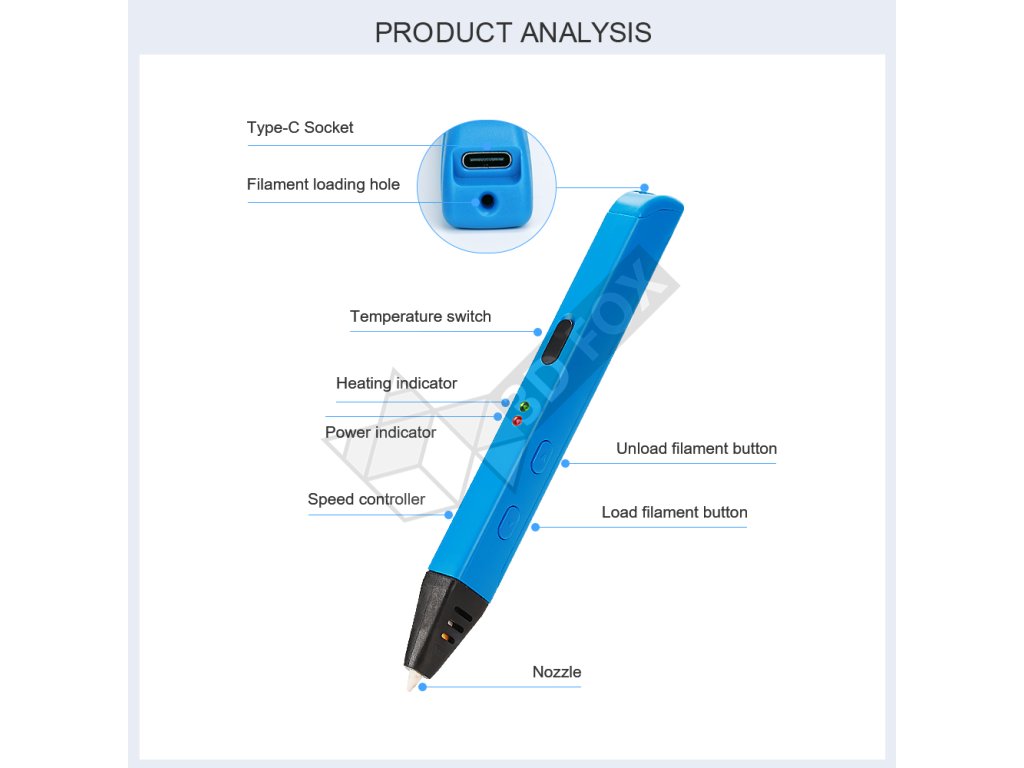 Tryska má průměr 0,6mm a je kompatibilní s filamentem o průměru 1,75 mm. Pero váží pouhých 46 g a má rozměry 175 × 17 × 20 mm. Součástí balení je 3D pero, tři PLA filamenty (3 m × 3 barvy), USB-C kabel, adaptér a plastový šroubováček pro nastavení teploty.