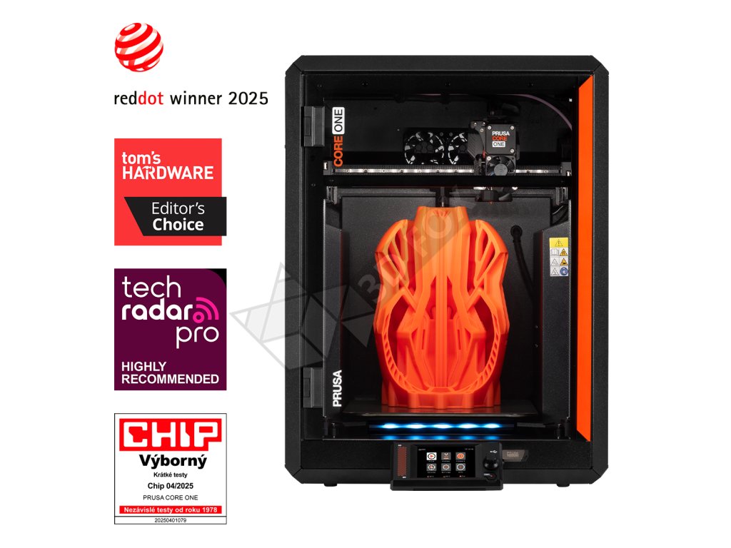 Prusa CORE One+ je další pracovitou 3D tiskárnou v léty ověřené tradici Prusa. Navrhli jsme ji pro maximální životnost a vyrobili ji ze špičkových materiálů. Díky tomu je CORE One+ výjimečně spolehlivá a vyžaduje minimální údržbu. Její uzavřená tisková komora je vybavena aktivní regulací teploty a umí dosáhnout až 55 °C. Díky tomu CORE One zaručuje perfektní tiskovou kvalitu napříč materiály: od PLA a PETG (i se zavřenými dveřmi) až po náročnější filamenty jako ASA, PC nebo Nylon.
