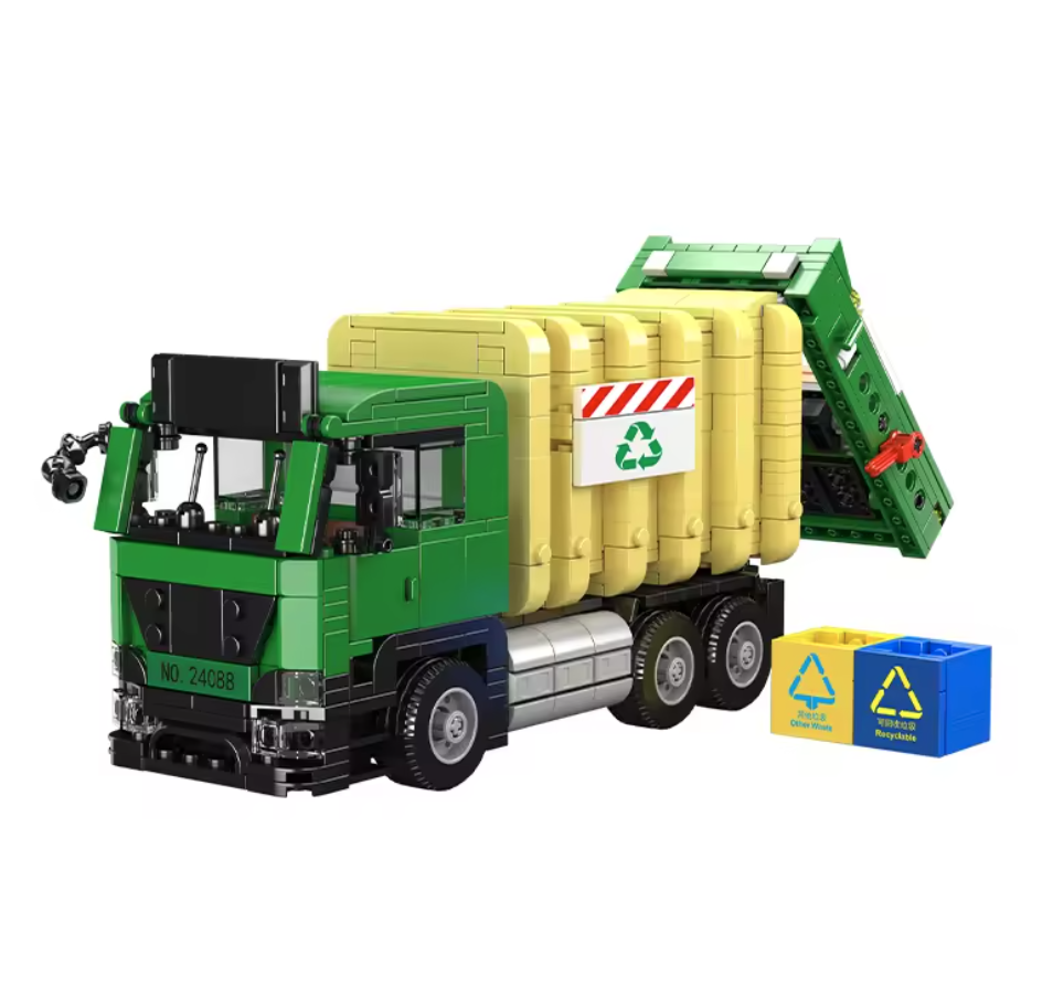 Detailně zpracovaný model komunálního vozu pro svoz recyklovaného odpadu přináší realistický pohled na fungování mechanismů městských technických služeb. Tento model, sestávající z 646 dílků, je navržen v charakteristické zeleno-žluté barevné kombinaci. Dominantním technologickým prvkem je plně funkční zadní zvedací mechanismus (výložník), který umožňuje mechanické uchopení, zdvih a vyprázdnění přiložených kontejnerů na tříděný odpad přímo do útrob vozu na bázi jednoduché pákové mechaniky.
